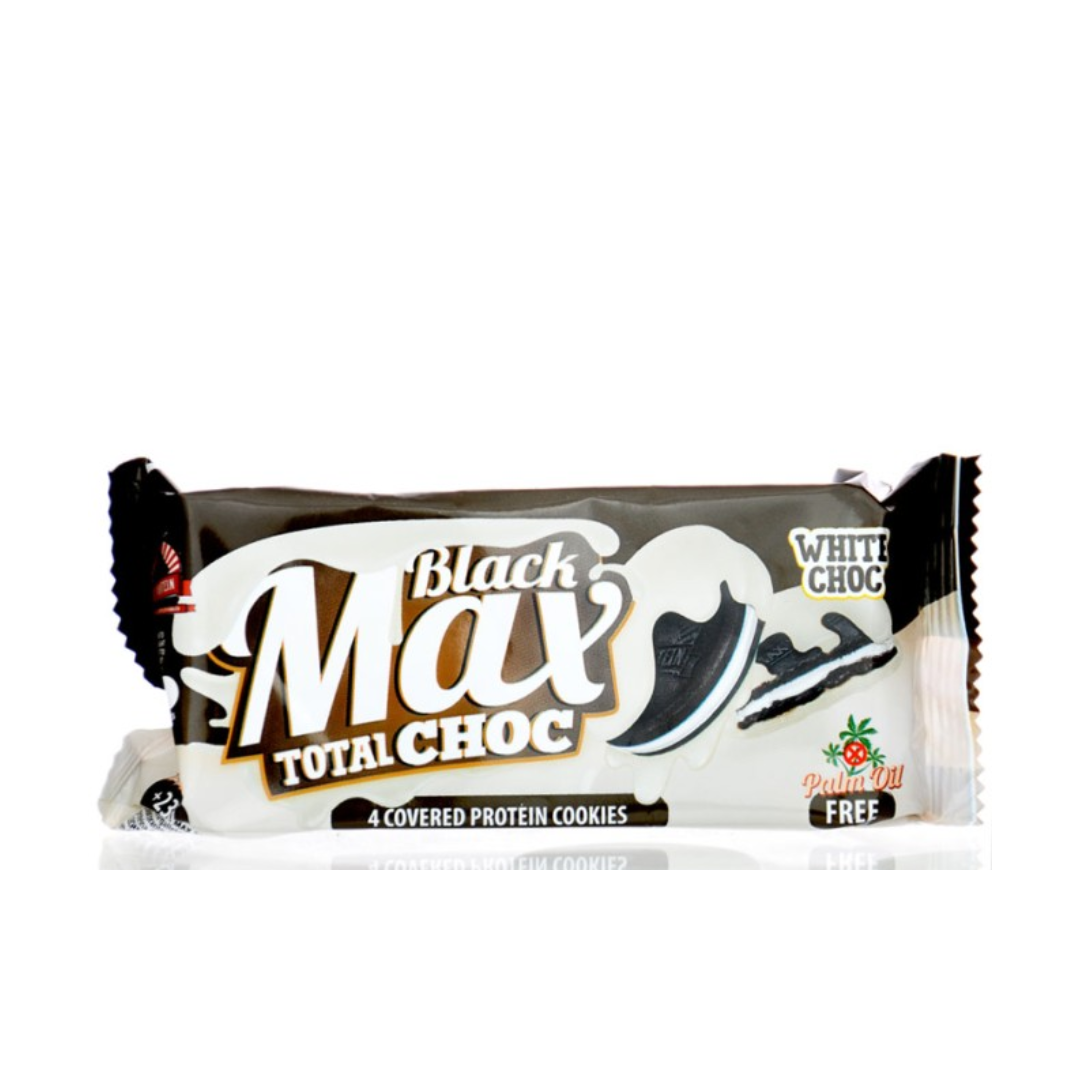 Black Max Total Choc are delicious low fat, crispy chocolate cookies without added sugar in a full bath of soft Belgian chocolate perfectly made to satisfy any sweet tooth. With 27g of protein and only 1.2g of sugar per pack of 4 cookies.