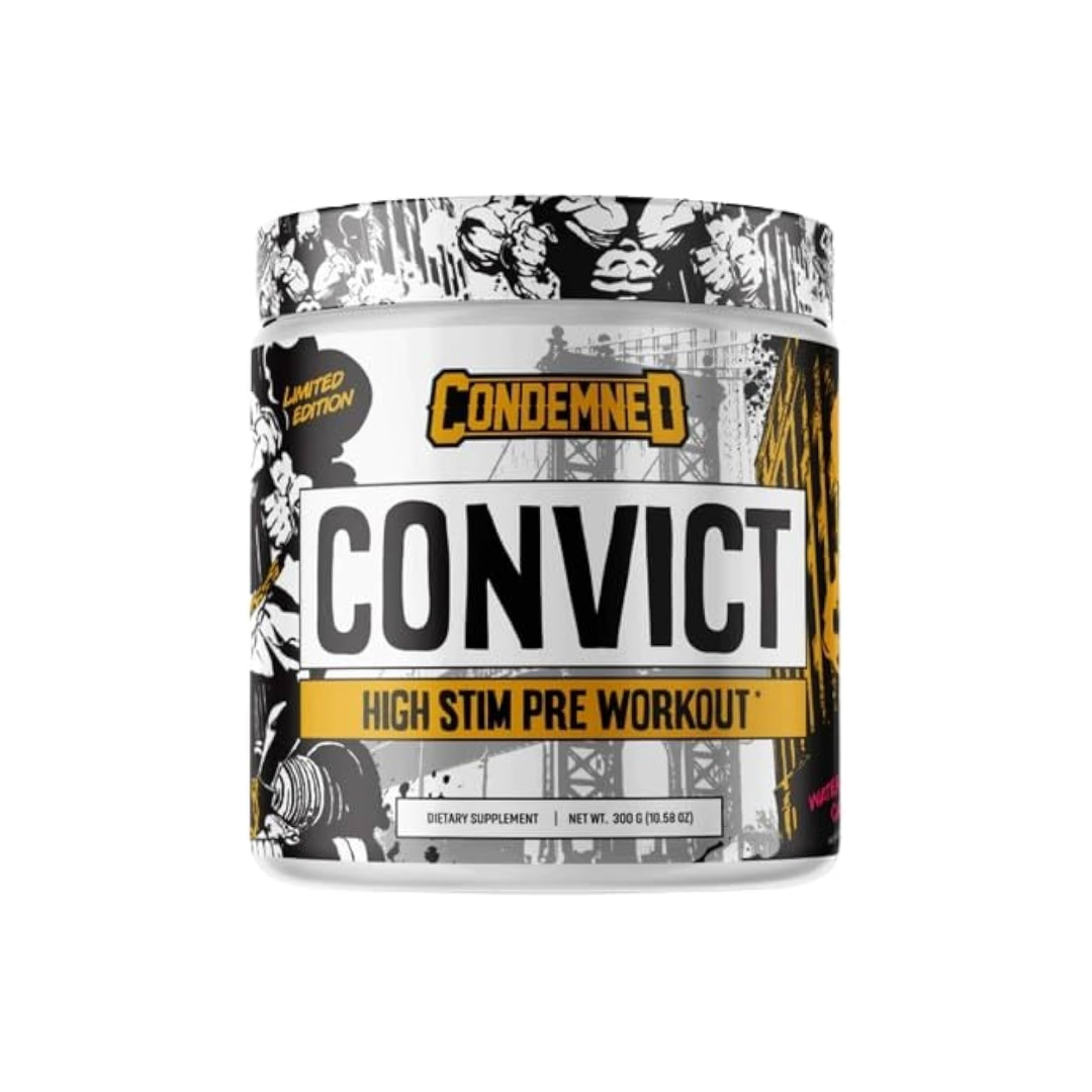 Condemned Labz Convict is a high-stimulant pre-workout supplement that provides intense energy, focus, and muscle pumps. It is available in a 50-serving size and comes in flavors like orange mango. The product details indicate that Convict NEW is the latest version, featuring a formula designed to accelerate results. Key ingredients include stimulants and pump-enhancing compounds to support workout performance. Users are advised to start with a half-serving to assess tolerance.