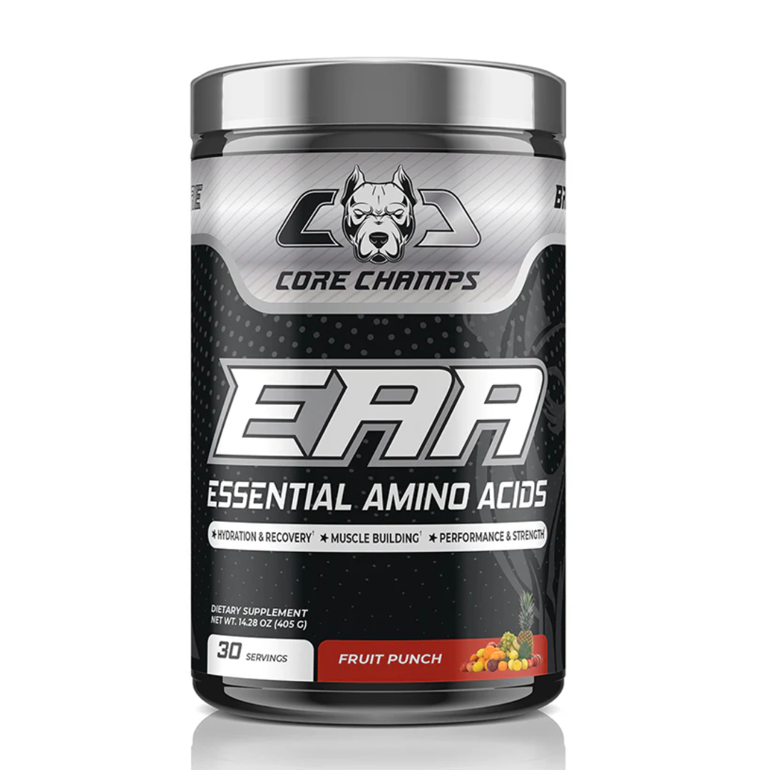 Core Champs EAA Essential Amino Acids packed with all 9 Essential Amino Acids (EAAs) which is critical for muscle protein synthesis, muscle growth, muscle preservation, enhanced endurance and recovery. Core Champs EAA Essential Amino Acids is formulated with a potent 9.7 grams supply of all nine Essential Amino Acids – L-Threonine, L-Lysine HCL, L-Methonine, L-Phenylalanine, L-Tryptophan, L-Histidine and of course the three Branched Chain Amino Acids ( L-Isoleucine, L-Leucine and L-Valine). Taking an EAA Supplement before, during or after your workout can produce an increase in Protein Synthesis that may create a positive protein balance and result in a muscle building (anabolic) state that allows you to recover and build muscle more easily. Essential Amino Acid Supplements are made of specific Amino Acids that are considered Essential. Of the 20 Amino Acids, 9 are considered Essential with Leucine, Valine and Isoleucine – the BCAAs – being amongst the most well known EAAs.The body cannot produce EAA on its own and need to be taken in from food/supplementation. Amino acids are the building blocks of protein, they are crucial in the synthesis of muscle growth and prevention of muscle catabolism. MUSCLE PROTEIN SYNTHESIS INCREASE ENDURANCE SUPPORTS MUSCLE GROWTH MUSCLE PRESERVATION BOOST RECOVERY EAA BLEND: 9700MG SERVINGS: 30 USAGES: 1 Scoop (13.5g)