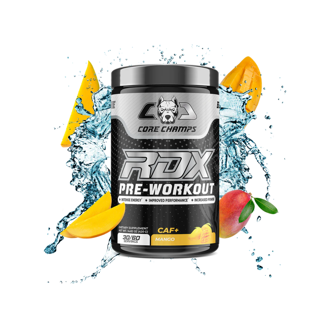 CORE CHAMPS RDX Pre-workout is a high-performance supplement designed to enhance energy, muscle pumps, and focus during workouts. It contains a blend of powerful ingredients such as beta-alanine, L-citrulline, L-arginine, creatine, and taurine. The Mango flavor is available in 30- and 60-serving
