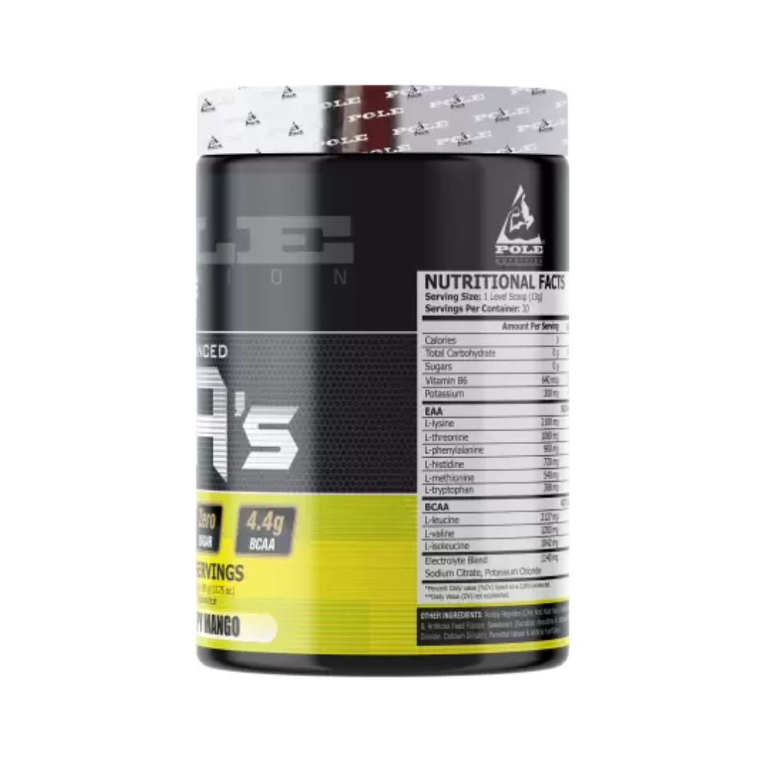 Pole Nutrition EAAs & BCAA Mix is a dietary supplement that contains a blend of essential amino acids (EAAs) and branched-chain amino acids (BCAAs). The Pulpy Mango flavor is a popular option. Key features of Pole Nutrition EAAs & BCAA Mix: Provides a clinically proven ratio of all 9 essential amino acids to support muscle growth, recovery, and endurance Contains additional ingredients like L-Taurine and Coconut Water Powder to enhance muscle pumps, blood flow, and strength gains Naturally flavored and sugar-free, with no artificial dyes or fillers Suitable for use during workouts on training days or throughout the day on non-training days