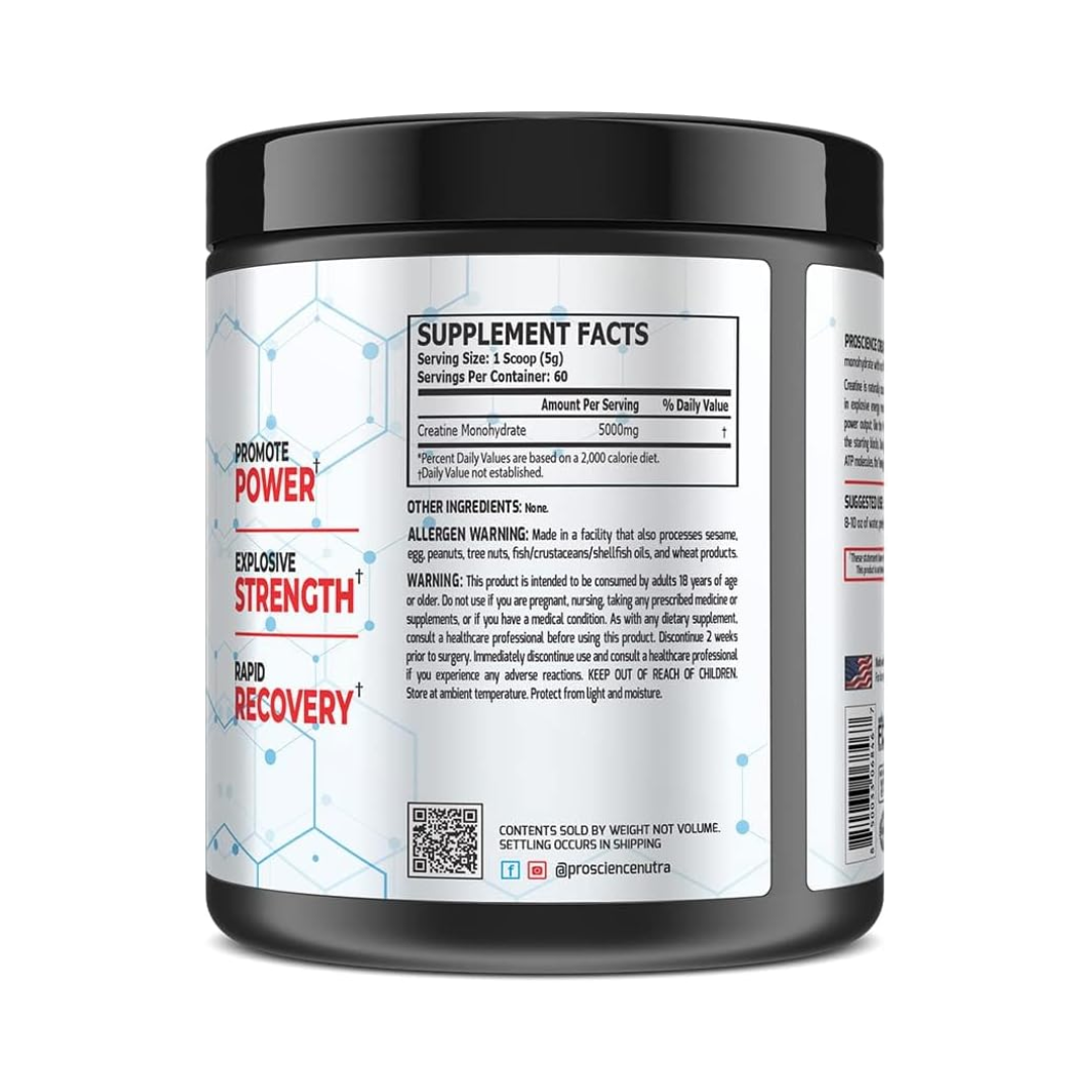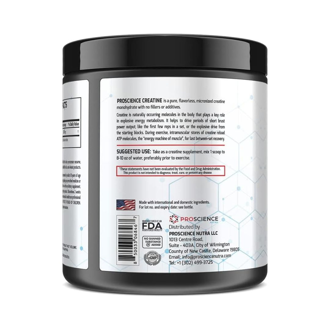 ProScience Creatine Monohydrate 5000mg is a pure, flavorless, micronized creatine monohydrate with no fillers or additives.