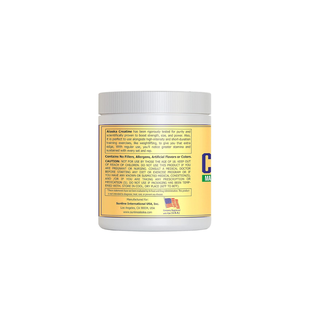 Sunline Alaska Creatine XS 3000mg 100 Servings – Blue Raspberry Creatine is a compound that occurs naturally in the body, primarily in skeletal muscle. Creatine’s function is to serve as a precursor to adenosine triphosphate (ATP), the form of chemical energy used by all cells.* Body stores of creatine create a pool of readily available ATP for energy, which is necessary for fueling quick bursts of power and strength.* Studies have demonstrated that creatine supplementation can help to maintain existing muscle tissue, support the growth and development of lean mass, and promote optimal performance during short bouts of intense exercise.* Sunline Creatine Monohydrate has no additives or preservatives. Natural color variation may occur in this product. – Pure Powder – Muscle Fuel – Lean Mass