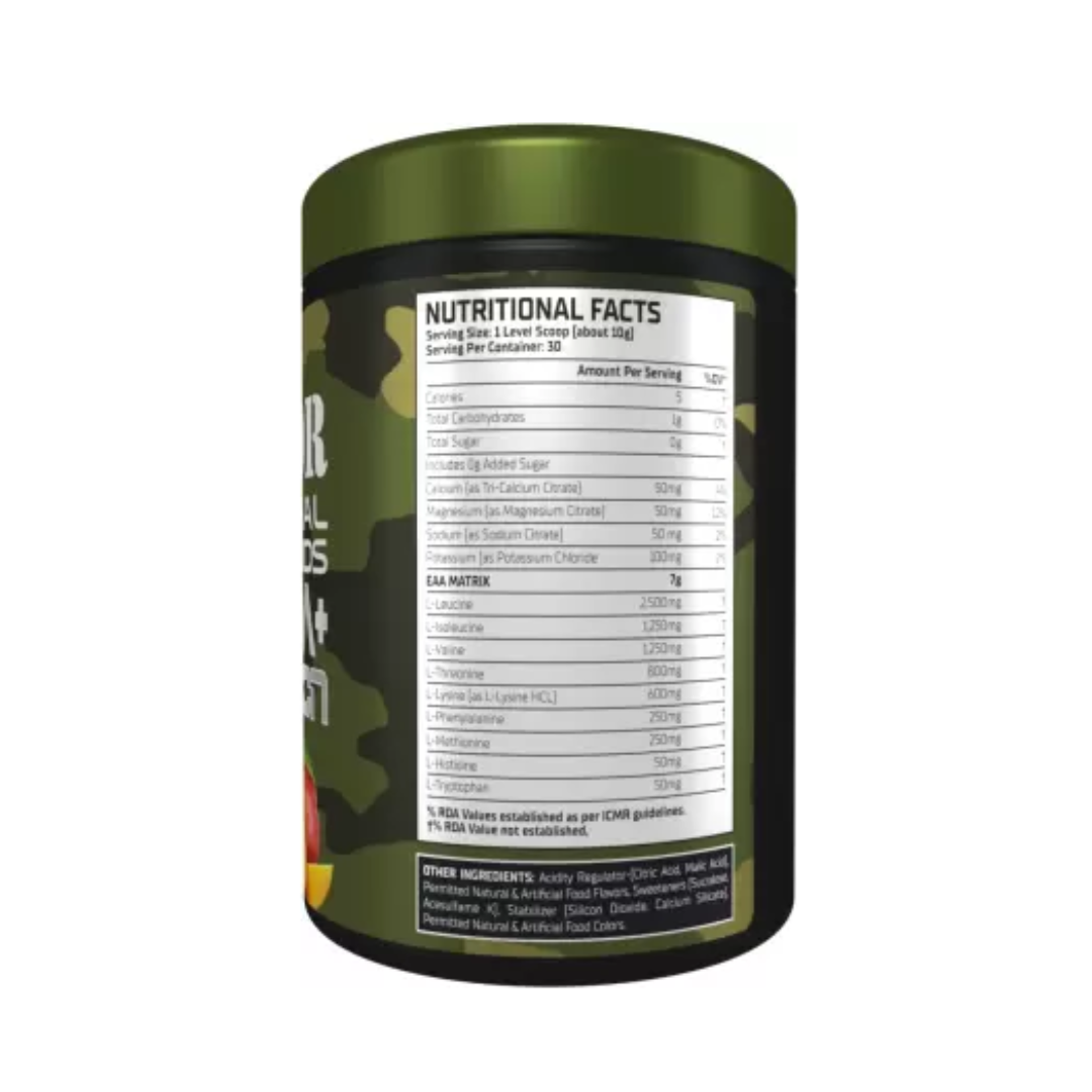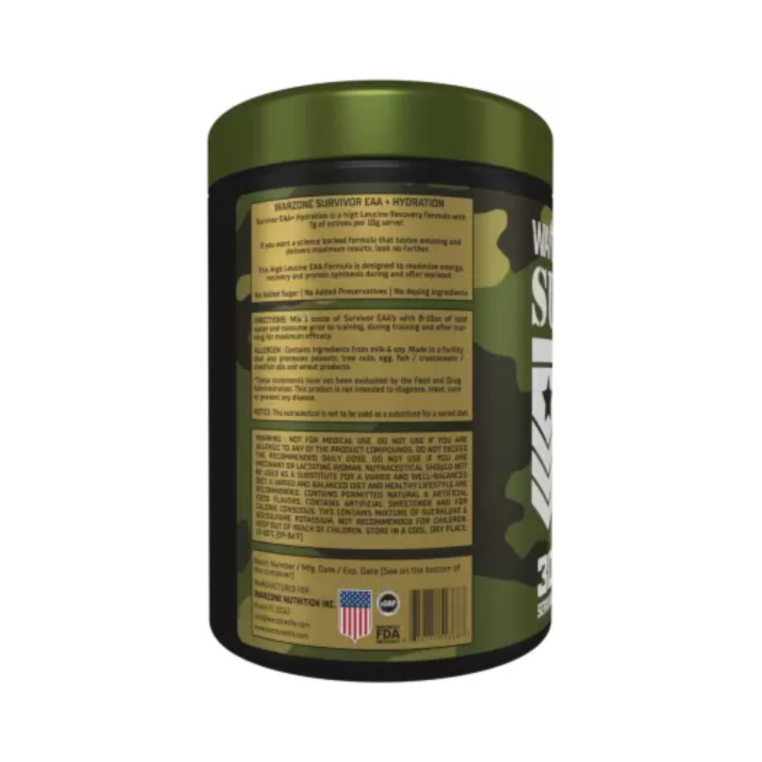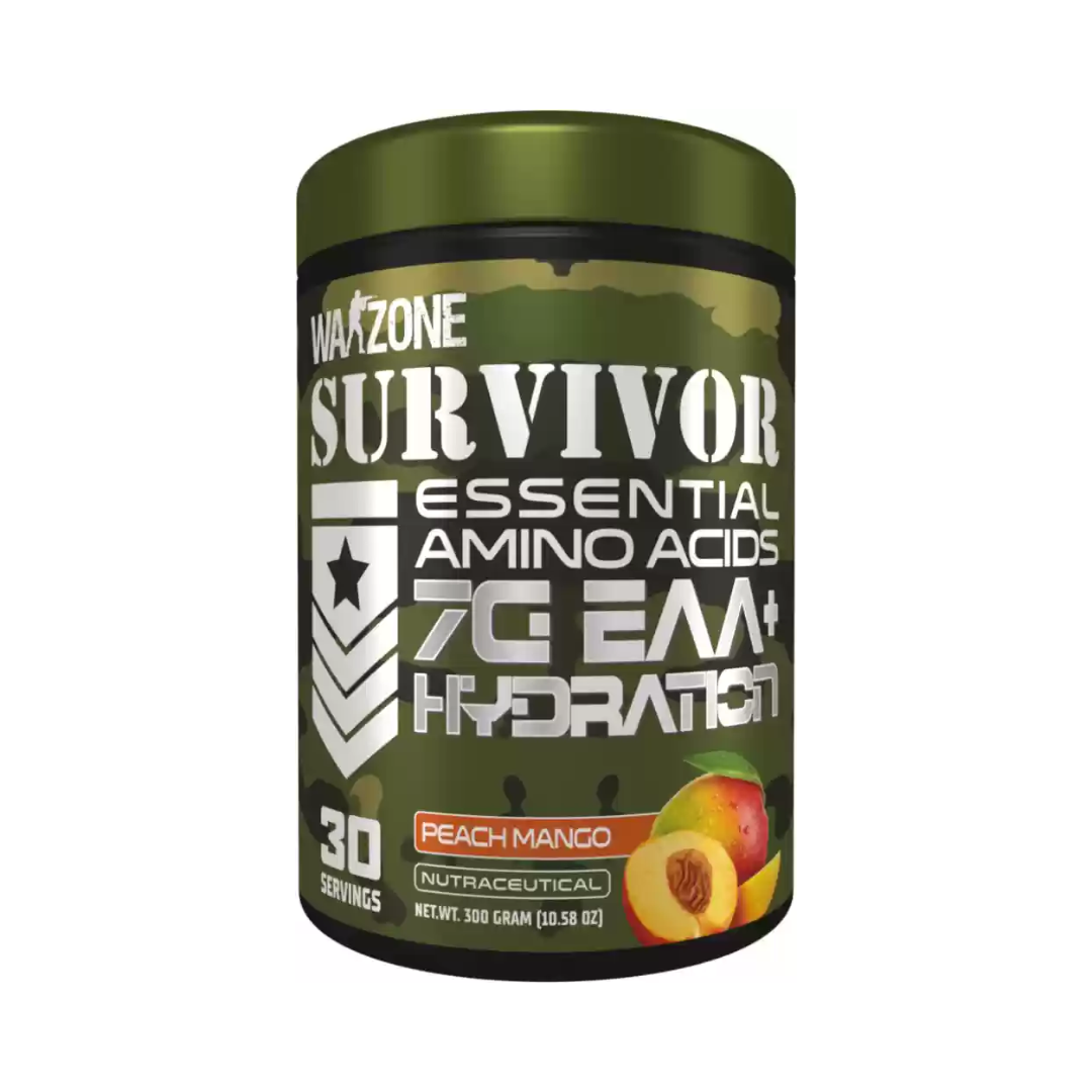 Warzone Survivor EAAs is a supplement that provides 7 grams of essential amino acids per scoop, including all the essential and branched-chain amino acids. Essential amino acids are the building blocks of proteins and perform important functions in the body like tissue repair and nutrient absorption. Warzone Survivor EAAs comes in a peach mango flavor and contains just 10 calories per serving, making it a low-calorie way to get your essential amino acids. It can be taken before, during, or after a workout to help support muscle recovery and performance. The supplement is available in 30-serving containers and can be mixed with water, milk, or almond milk. Warzone recommends taking 1 scoop for those under 150 lbs and 2 scoops for those over 150 lbs, depending on your protein needs.