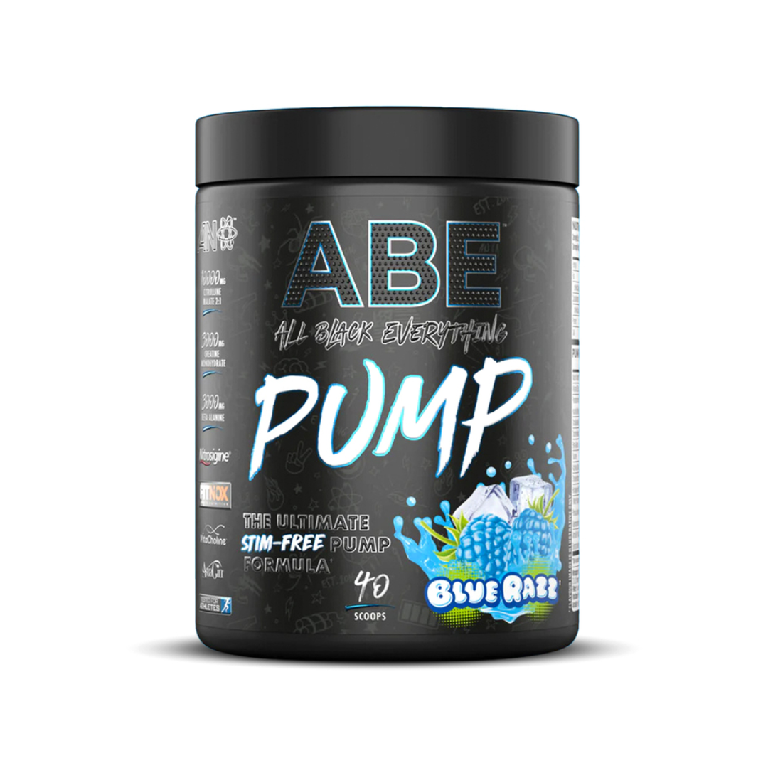 ABE Pump Stim Free Blue Razz are: Citrulline Malate 2:1 Beta Alanine Creatine Monohydrate Taurine Arginine Silicate Inositol (as NitrosigineĀ®) These ingredients are designed to provide explosive focus, energy, and long-lasting muscle pumps without the use of stimulants like caffeine.