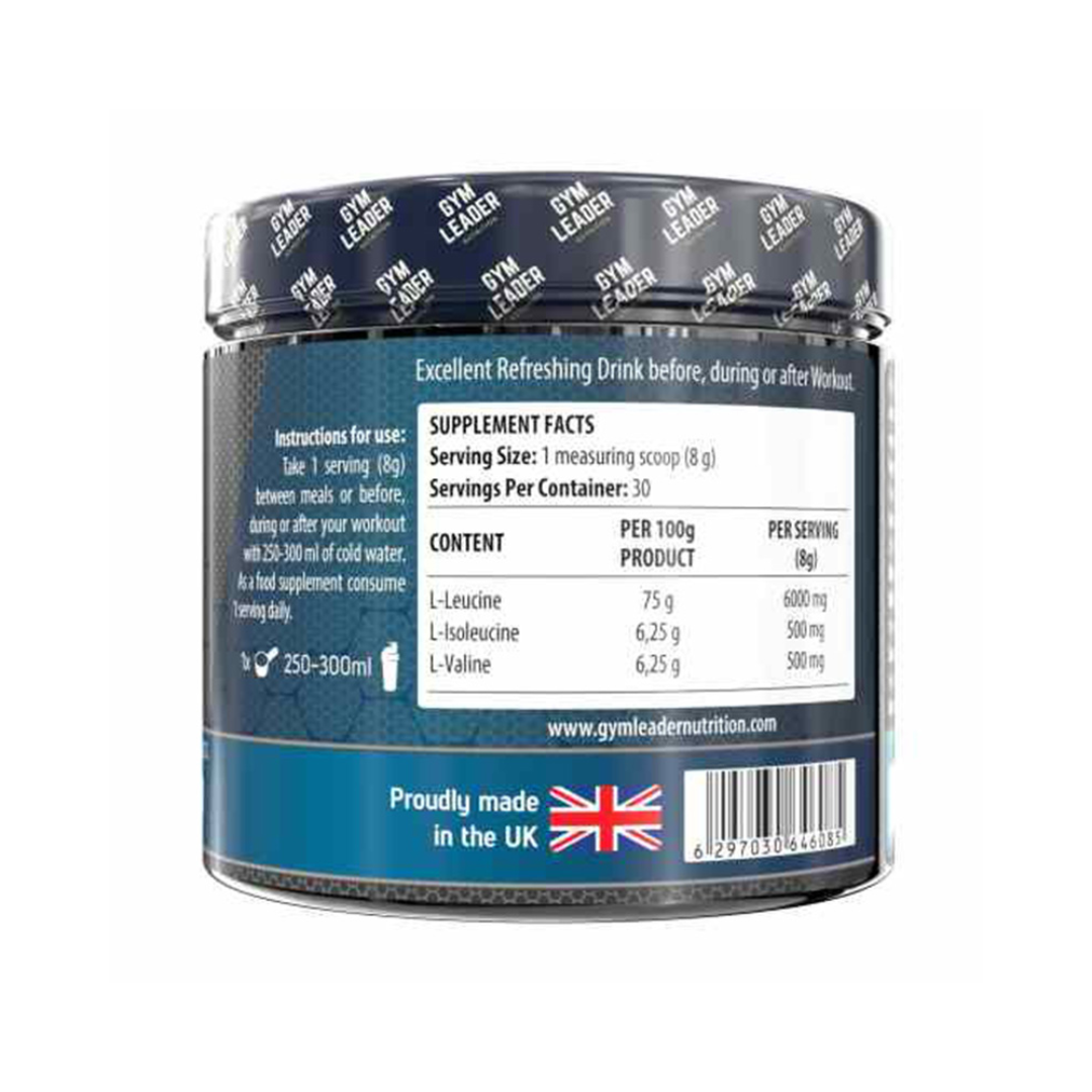 he Gym Leader BCAA 12:1:1 Apple 30 Servings is a branched-chain amino acid (BCAA) supplement that contains L-Leucine, L-Isoleucine, and L-Valine in a 12:1:1 ratio. It is intended to support the nutritional needs of physically active individuals and strength training athletes. The product provides 7,000mg of BCAAs per serving and is available in an apple flavor. It can be consumed between meals, before, during, or after a workout, with the recommended dosage being one 8g serving per day.