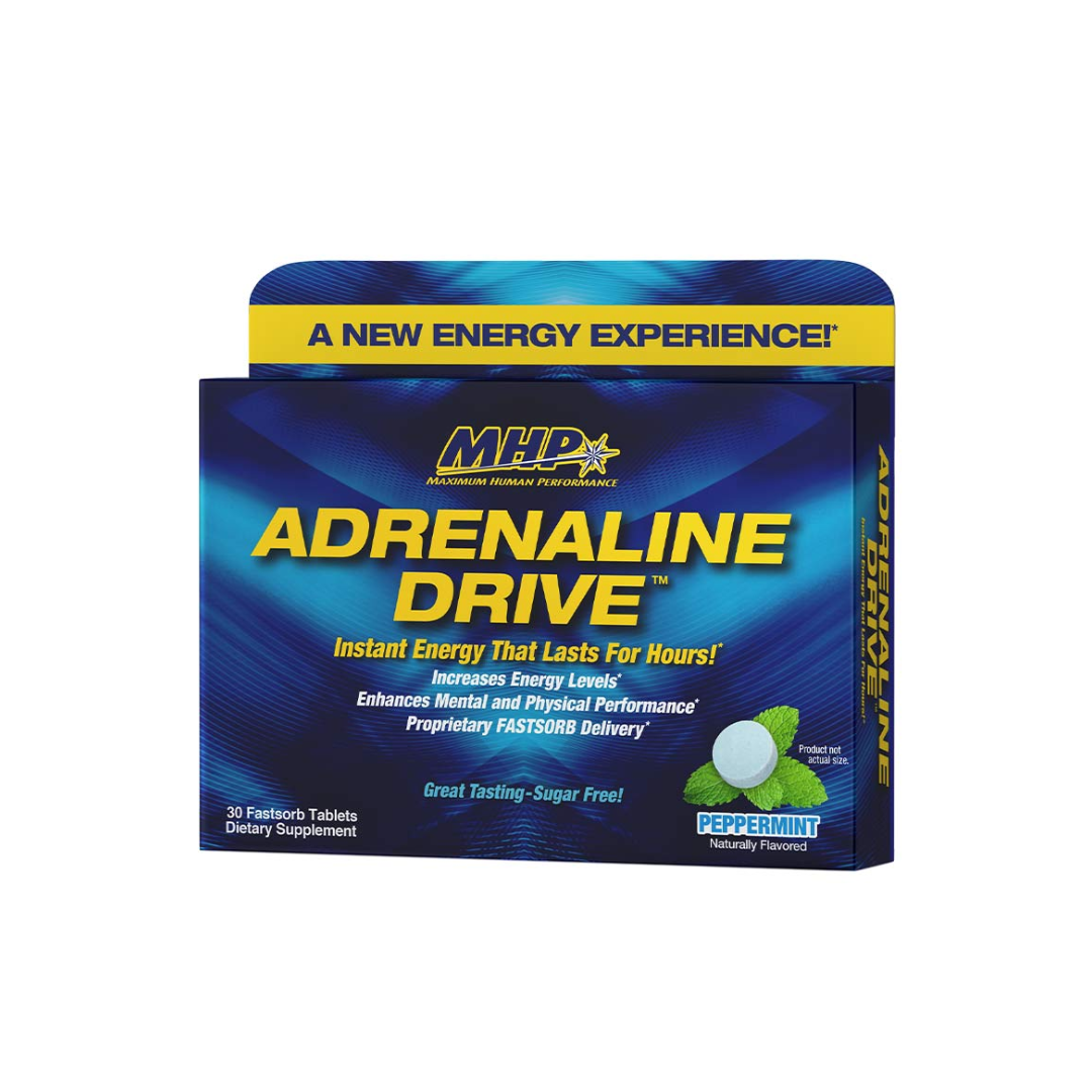 MHP Adrenaline Drive is a dietary supplement that provides a quick energy boost and enhanced mental focus. It contains 150mg of caffeine per tablet, along with peppermint for a refreshing sensation. The fast-dissolving tablets are designed to deliver a rapid increase in adrenaline secretion for improved physical and mental performance. MHP Adrenaline Drive is available in a 30-tablet bottle and is marketed as a sugar-free, instant energy supplement for heavy workouts or demanding tasks.