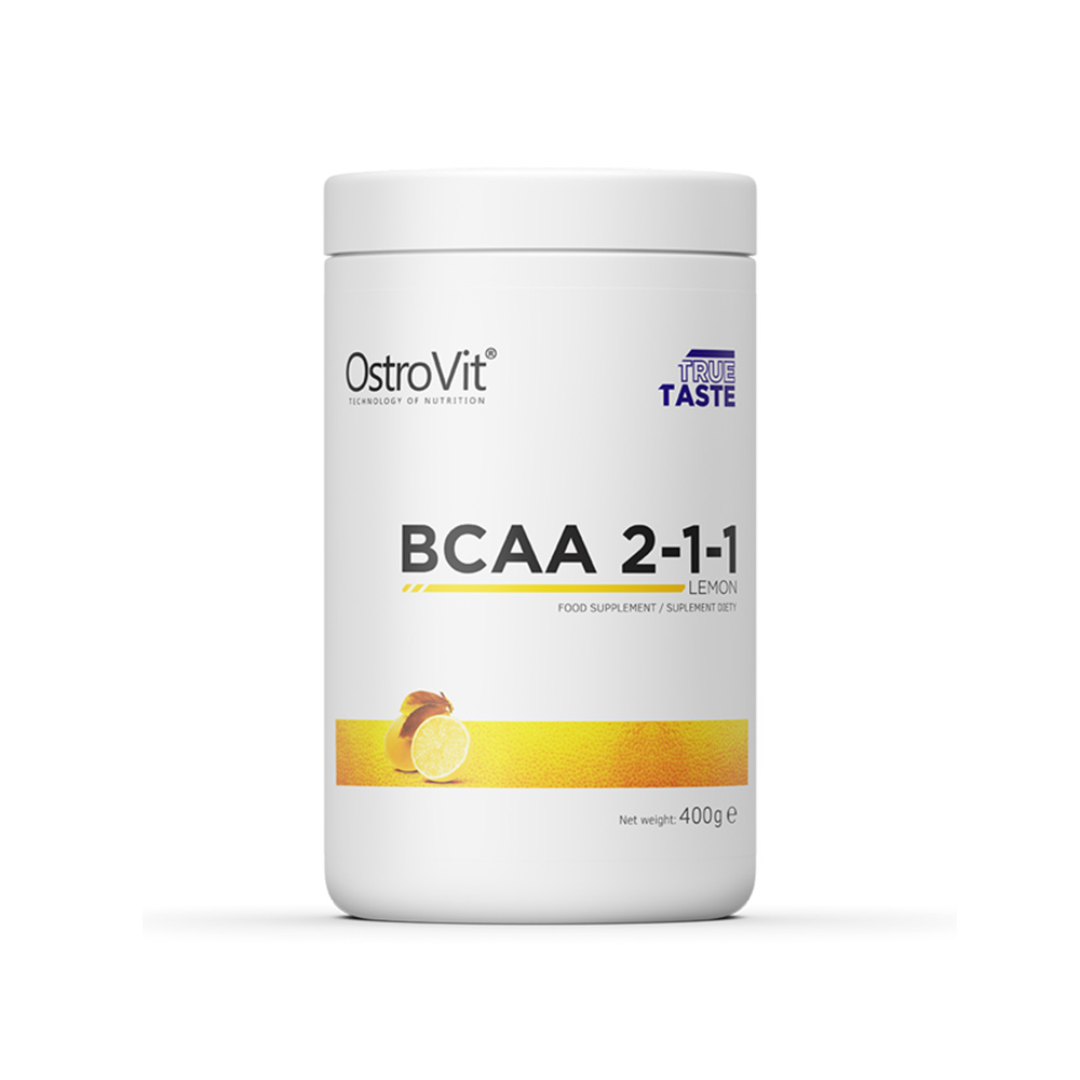 OstroVit BCAA 2-1-1 400 g lemon is a high-quality dietary supplement that contains branched chain amino acids (BCAAs) in a 2:1:1 ratio of L-leucine, L-isoleucine, and L-valine. It provides 4000 mg of L-leucine, 2000 mg of L-isoleucine, and 2000 mg of L-valine per serving. The supplement is available in a convenient powder form with a delicious lemon flavor and no added sugar. It is designed for athletes and physically active individuals to help support muscle building and recovery. The recommended dosage is 10 g (1.7 scoops) mixed in 100-150 ml of water or juice, consumed either before or after a workout on training days, or after waking up on non-workout days. While generally safe, exceeding the recommended dosage may lead to digestive issues or other side effects.