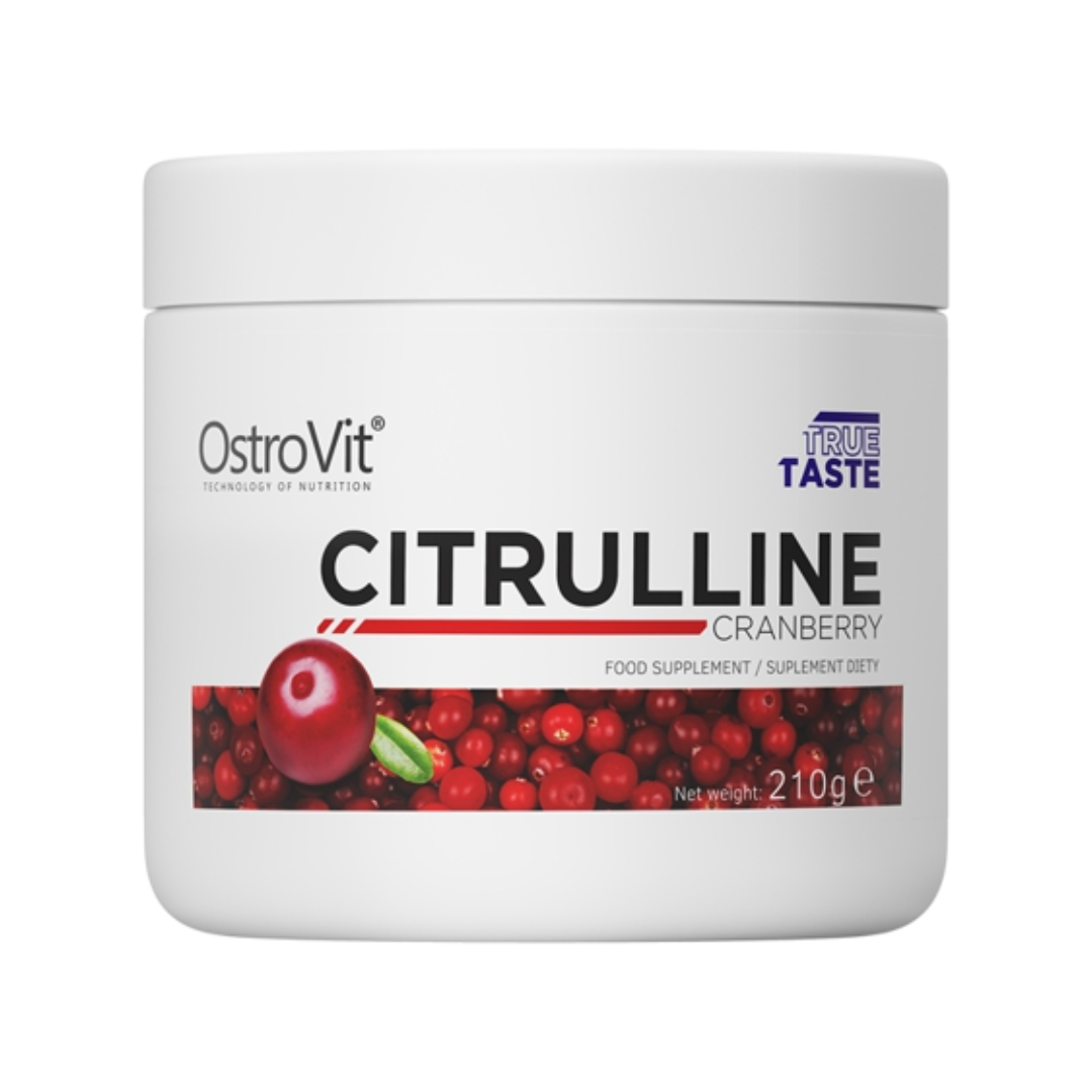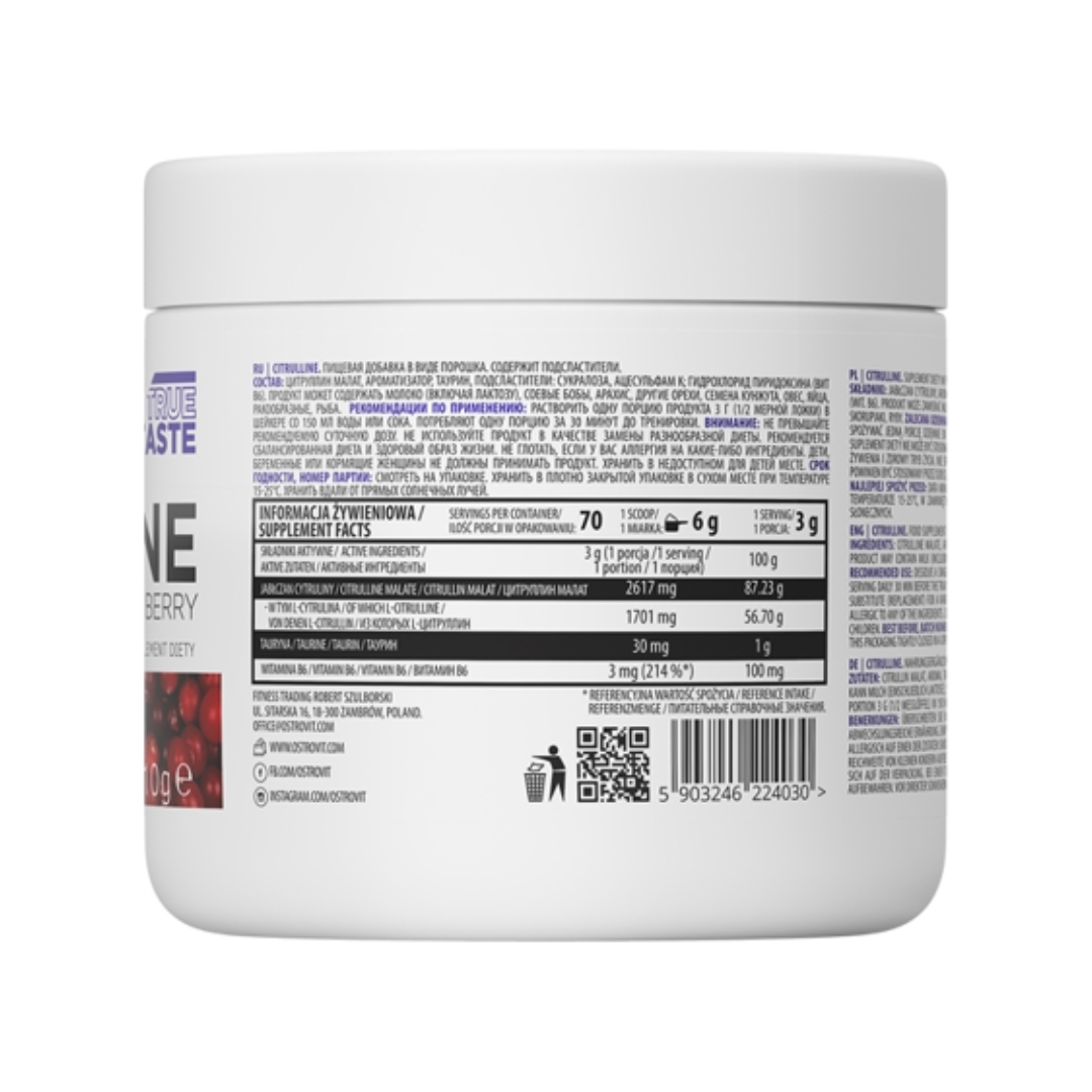 OstroVit Citrulline is a high-quality dietary supplement that contains 2670 mg of citrulline malate per serving (1/2 scoop = 3 g) in a delicious raspberry flavor. It also includes 30 mg of taurine and 3 mg of vitamin B6. The product is available in powder form without added sugar, making it convenient for athletes and physically active individuals. Citrulline malate has excellent bioavailability and ergogenicity, which can help reduce fatigue, improve muscle recovery, and enhance blood flow and nutrient delivery. OstroVit Citrulline comes in a 210 g package with 70 servings.