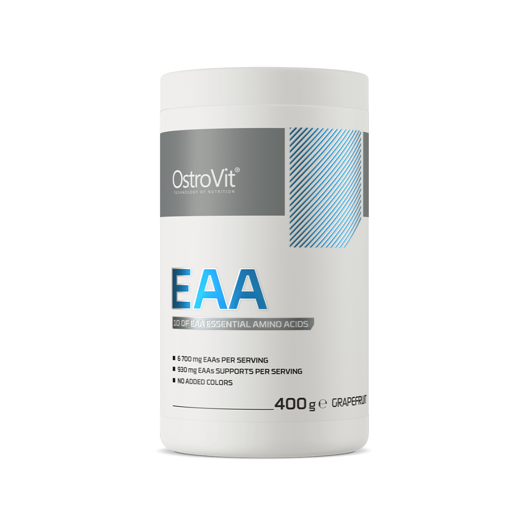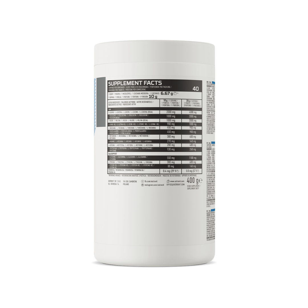 EAAs are a group of amino acids that the body cannot synthesize on its own and must be obtained through diet or supplementation. The OstroVit EAA formula includes the BCAA complex (leucine, valine, isoleucine) as well as lysine, threonine, phenylalanine, methionine, arginine, histidine, and tryptophan.