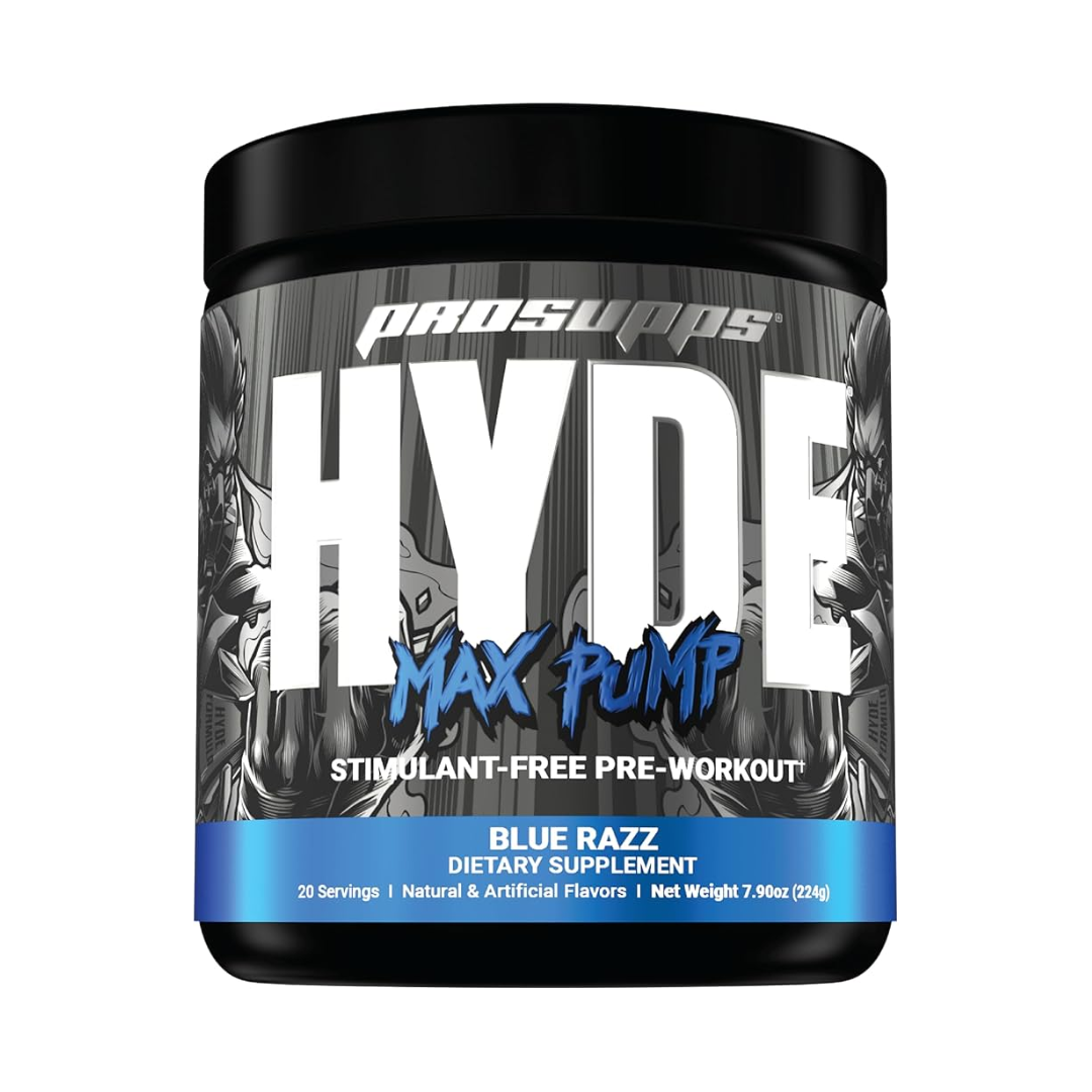 Pro Supps Hyde Max Pump is a stimulant-free pre-workout supplement designed to maximize blood flow and muscle pumps. It contains well-dosed citrulline to increase nitric oxide levels and promote vasodilation for enhanced exercise performance and muscle volume. Customers report experiencing “exploding arms pumps” and increased vascularity when using this product. Hyde Max Pump is available in a Blue Razz flavor and provides 20-25 servings per container