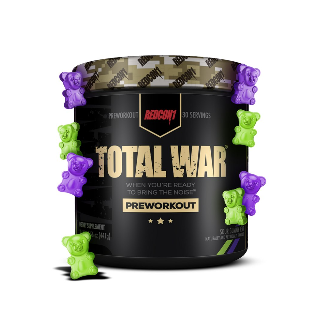 Redcon1 Total War is a pre-workout supplement that comes in a Sour Gummy Bear flavor. It is designed to boost energy, increase endurance and focus, and provide a powerful combination of stimulants and focus factors along with N.O. compounds. Each serving contains 320mg of caffeine and 3.2g of beta-alanine, among other ingredients