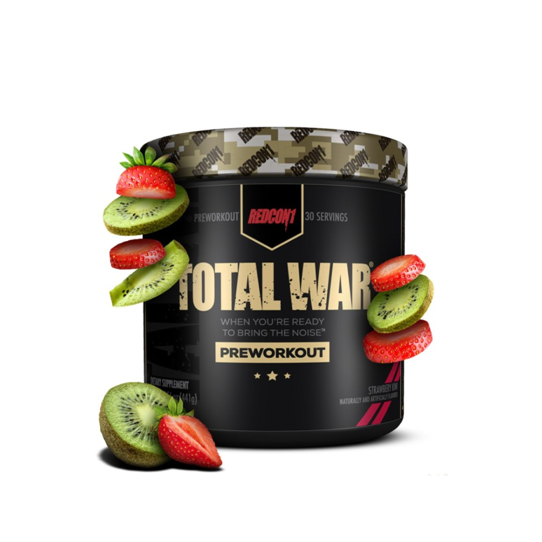 REDCON1 Total War is a pre-workout supplement that delivers rapid power, focus, and endurance for transformative workouts. It contains 320mg of caffeine from various sources like caffeine anhydrous and di-caffeine malate, along with other ingredients like beta-alanine, citrulline malate, and juniper berry extract. The Strawberry Kiwi flavor offers a delicious and refreshing taste without sacrificing workout energy. Each container provides 30 clinically dosed servings, making it suitable for cardio-intense days.