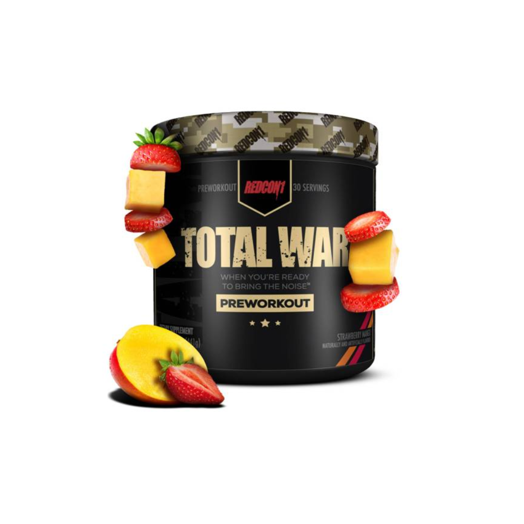 Redcon1 Total War is a pre-workout supplement that comes in a strawberry mango flavor. It is formulated with ingredients like caffeine, green tea, beta-alanine, and juniper to provide energy, focus, and power for intense workouts. The product is available in 30-serving containers and is recommended to be mixed with 4-6 oz of water and consumed 30 minutes before training.